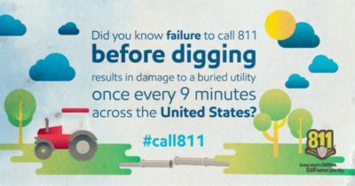 An underground utility line is damaged once every nine minutes because someone neglected to call 811 prior to excavation activities. Calling 811 or clicking before you dig reduces the risk of causing damage to less than one percent.